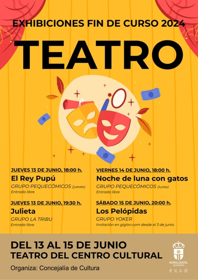 Exhibiciones fin de curso 2024 de los grupos de Teatro en MoralzarzalEse es el programa fin de curso 2024 de los grupos de Teatro: